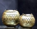 The image depicts two decorative brass bowls with handles, sitting on a table. The bowls have a floral design etched on their surface.